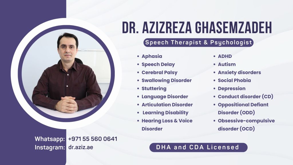 Dr. Azizreza Ghasemzadeh’s rehabilitation department at Armada Clinic is a specialized centre in various fields of mental health and rehabilitation. It offers the latest methods of psychotherapy and rehabilitation interventions for a wide range of issues, including speech delay, cerebral palsy, aphasia, autism, attention deficit hyperactivity disorder (ADHD), speech disorders, stuttering, anxiety disorders, depression, oppositional defiant disorder, obsessive-compulsive disorder, and more. Dr. Ghasemzadeh has over twenty years of experience in speech therapy, brain training consultations, and psychology in Dubai. Additionally, he holds official licenses from both the Community Development Authority (CDA) and the Dubai Health Authority (DHA).